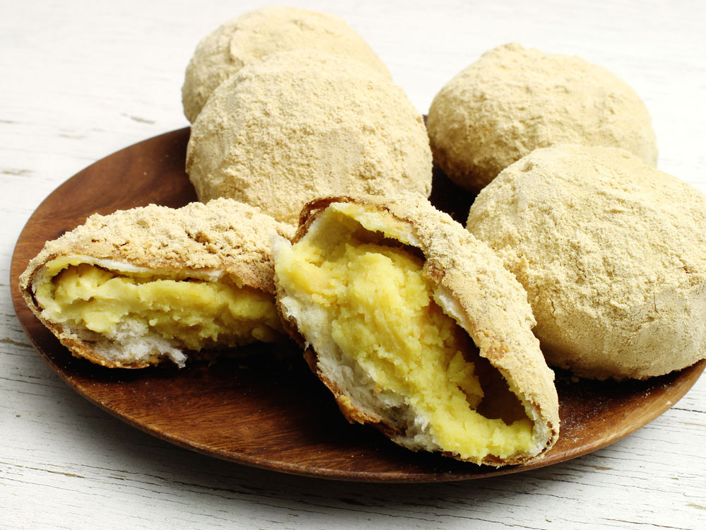 スイートポテトのような味わいのフィリングと表面にまぶしたきな粉シュガーの、優しい味わいをお楽しみいただけます。