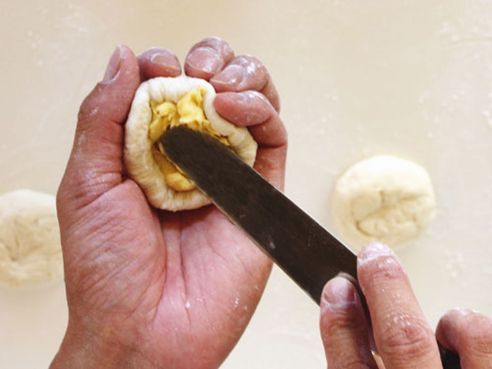 秋の味覚さつま芋の紅はるかペーストをベースに使ったフィリングを包み込んだ、もちもちとした揚げパンです。