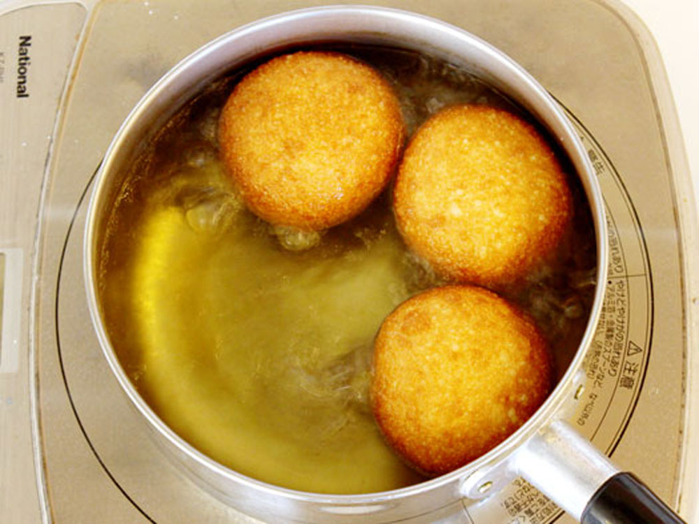 揚げる前、常温に5分ほど置いて表面を乾燥させるラックタイムを取ると、キレイに揚がりやすくなります。