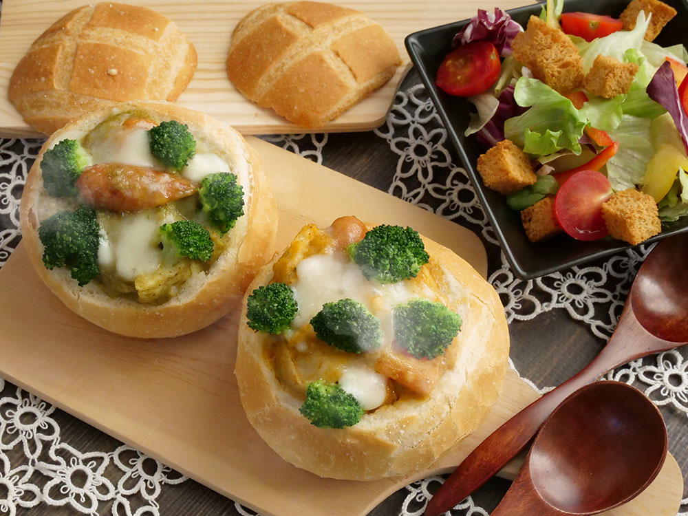 パンの中をくり抜き、シチューとくり抜いたパンを入れ、上から粉チーズをかけたら再度、オーブンで8~10分温めて完成です。
